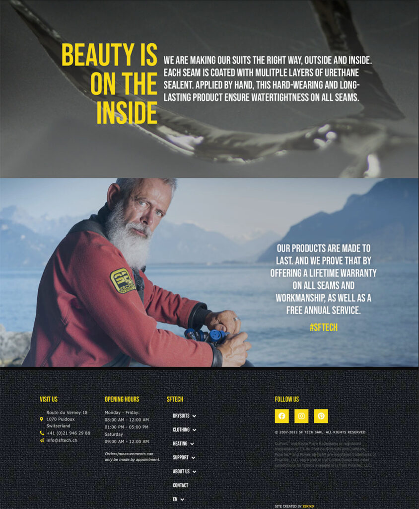 La conception de ce site a demandé plusieurs mois de travail. l’idée était d’avoir un impact important sur les visuels qui prennent une place omniprésente dans chaque pages. Les tons bruts, notamment le jaune vif de leur logo et le côté matériaux des combis crée une expérience visuelle cohérente tout au long du site.
