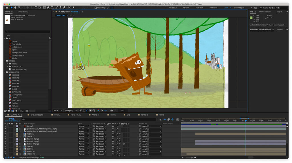 Une fois l’ensemble de toutes les images finalisées celles-ci sont assemblées dans After Effect puis la piste son réalisée sous Logic Pro est ajoutée à la version finale.