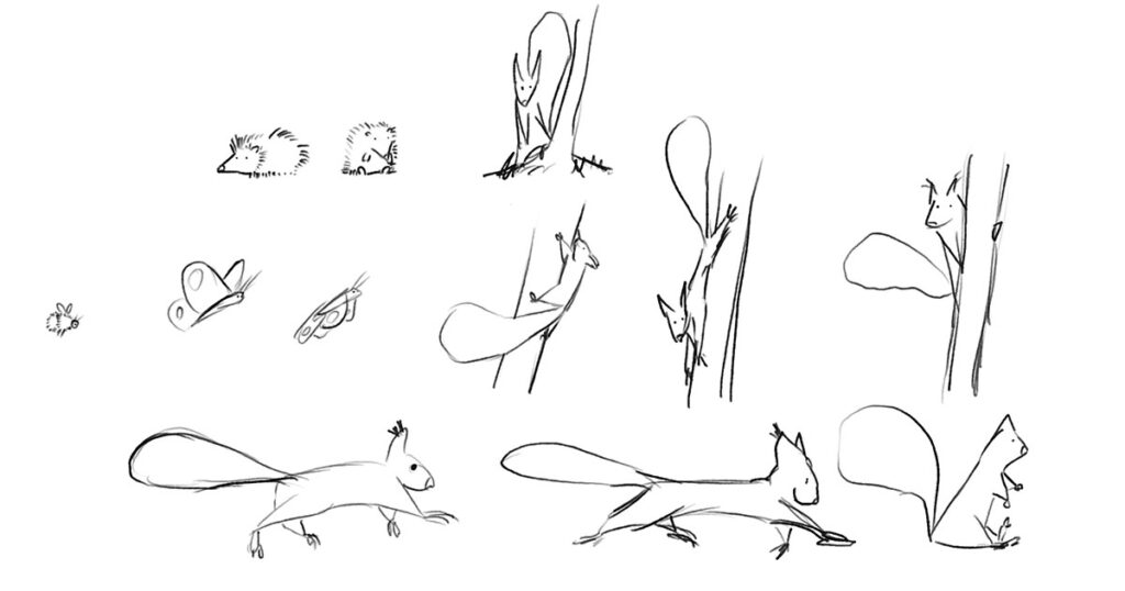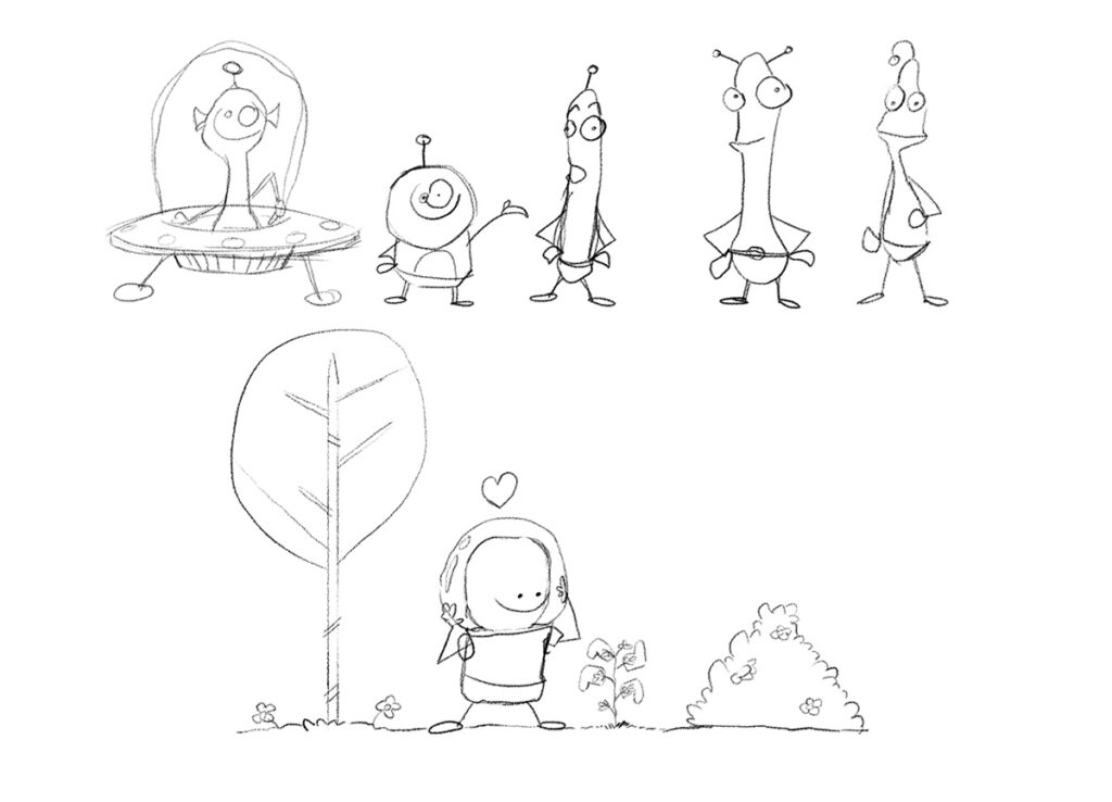 Quelques croquis pour la recherche du personnage et de l’environnement à créer.